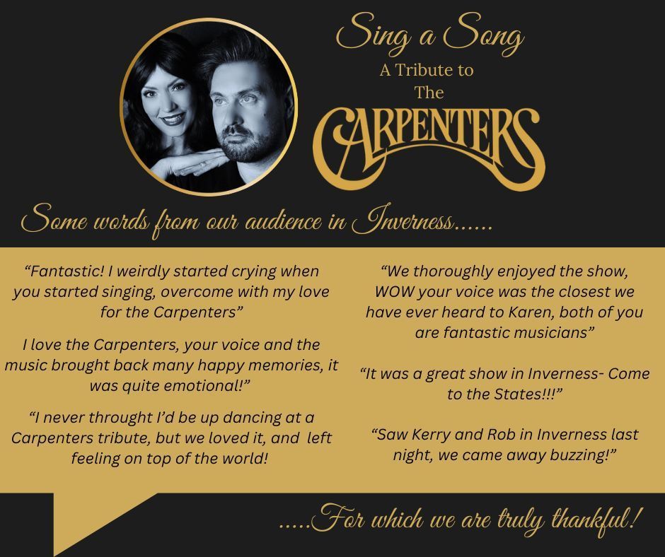 Kerry Burley and Rob Gallagher present Sing a Song: A Tribute to The Carpenters - an international tribute to the iconic 70s duo. Based in Scotland, the band have toured the UK, Ireland and Asia both as a duo and with their talented six-piece band.